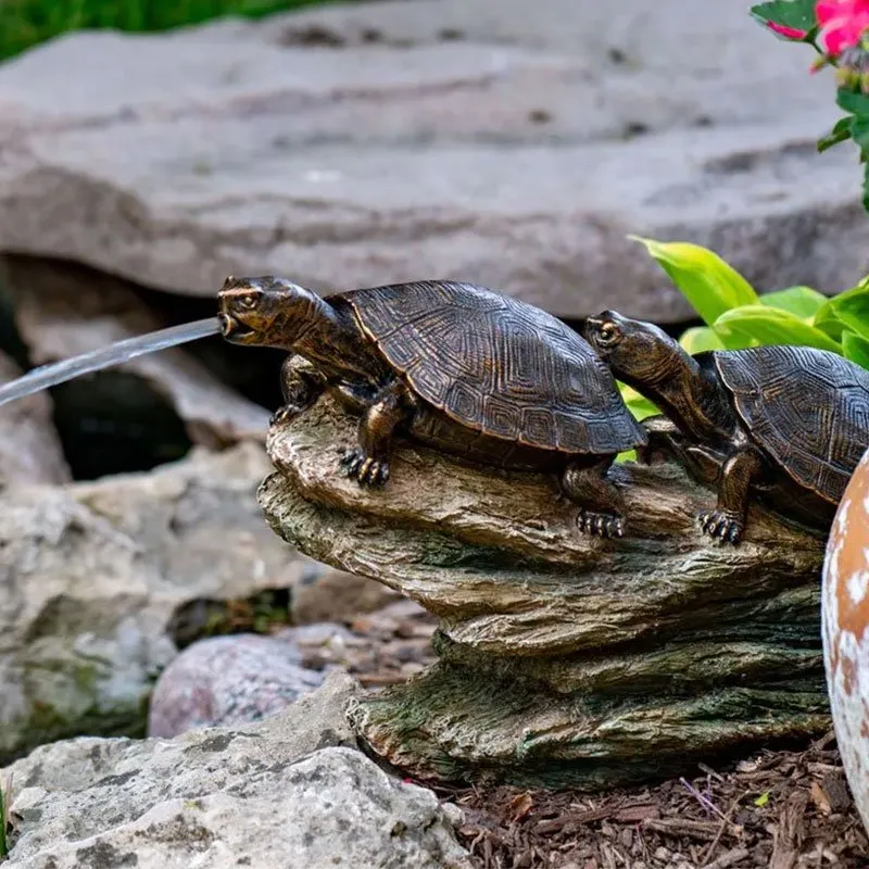 Enhance your pond or water feature with the Aquascape Double Turtle on Log Spitter. Made from high-quality polystone material, this accent piece is lightweight, easy to install, and resistant to UV and heat exposure. The turtles sit atop a faux log and provide relaxing sounds as the water pours from the mouth of the front turtle. The realistic faux brass finish and ideal size makes this feature great for any location, including streams, ponds, wetlands, and even patio ponds. The fountain measures 14.75″ long and 10″ high.