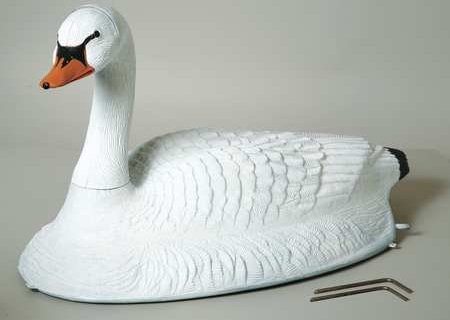 Each swan is constructed of durable polyresin with a long-lasting, all-weather finish for years of trouble-free use. The decoy can be used floating on the water or on dry land and includes an anchor tab which makes it easy to secure the swan in place.