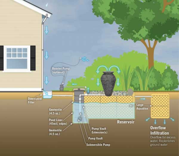 Larger Rain Water Harvesting systems can also be constructed using a sub-surface RainXchange® System. This system is a revolutionary design that combines a re-circulating decorative water feature with a sub-surface Rain Water Harvesting storage system. The clean, filtered water that is stored can be used for irrigation or to maintain the water level in the decorative water feature.