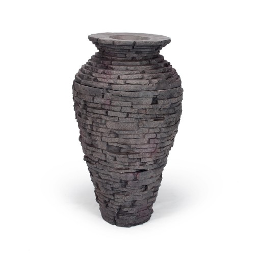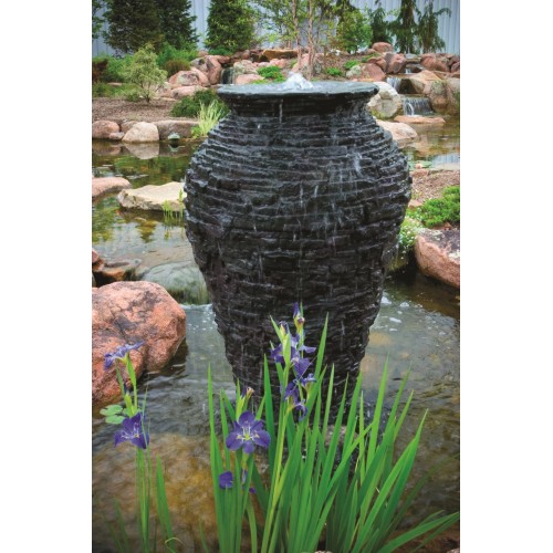 Aquascape Small Stacked Slate Urn Fountain is made of light-weight, durable fiberglass-resin composite that provides all of the natural beauty of real rock with the added benefits of fiberglass. The natural rock veneer imitates a natural stacked slate design, will not fade or chip and ages like real stone, providing the perfect fountain for your enjoyment. The Stacked Slate Urn Fountain can be added to a water basin and pump for a complete, functioning fountain or can also be added to existing ponds for an impressive decorative accent. 25 in. diameter x 32" H