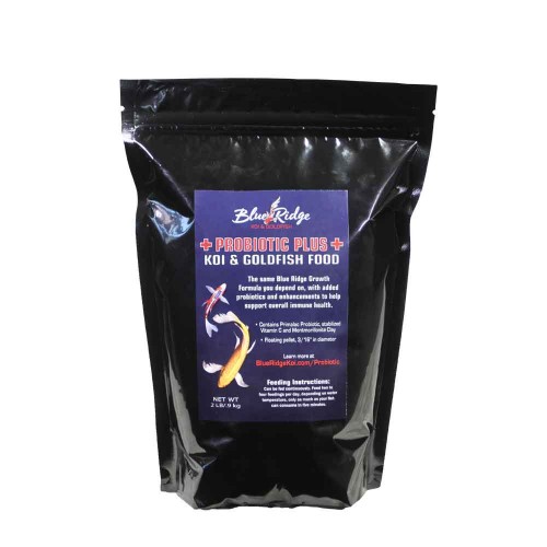 Blue Ridge Probiotic Plus Fsh Food is specially formulated with three key ingredients to boost Koi and Goldfish immunity, prevent disease and infection, and keep fish happy and healthy. Probiotic Plus contains Primalac probiotic, elevated Vitamin C and montmorillonite clay. These ingredients are shown to increase immunity to bacterial infection and disease, improve digestion and growth rates, enhance coloring and replace essential minerals and trace elements that are typically filtered out of municipal water sources.