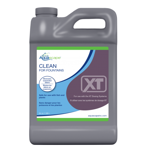 Aquascape Clean for Fountains XT effectively cleans and clarifies fountains and fountain water to keep water features clean and clear while significantly reducing maintenance and issues with water quality. Clean for Fountains XT is available in half gallon and gallon options and designed only for use with the Smart Pond Dosing System XT. This special formulation is ideal for water features with standing water, including commercial fountains and other features containing fish or plants. This easy-to-use water treatment contains a fast-acting flocculant and phosphate binder to help clump and clear suspended debris. Clean for Fountains XT also safely prevents and eliminates foam. Clean for Fountains XT is safe for fish, plants, pets, and wildlife.